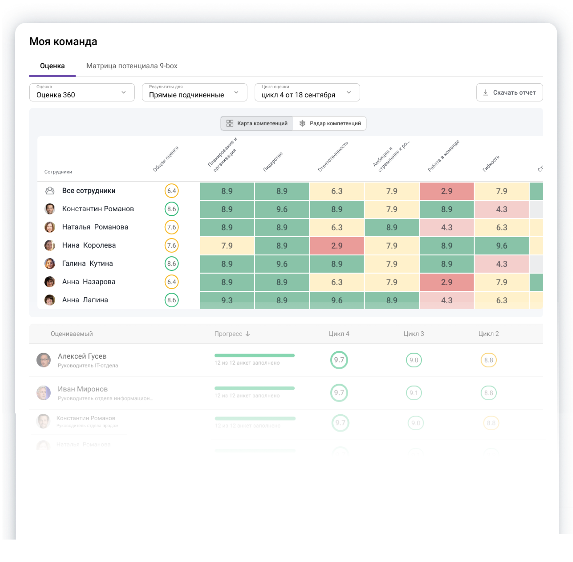 Легко сравнивайте циклы оценки и находите проблемные зоны и точки роста сотрудников.