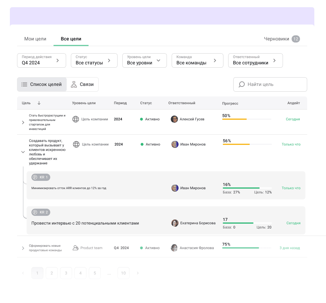 Подкрепляйте цели метриками: в виде чисел, процентов и to-do листов. Отслеживайте прогресс по отдельным сотрудникам и командам.