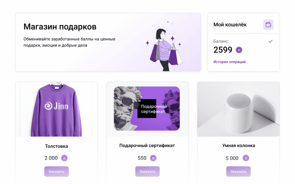 В Jinn уже есть все необходимое, чтобы ваши сотрудники полюбили проходить опросы и давать обратную связь: корпоративная валюта, магазин подарков, система вознаграждения за действия.